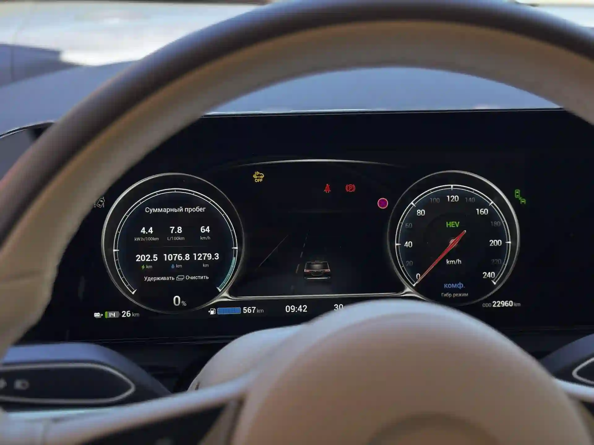 Из них чуть более 1000 км я проехал на топливе и 200 с небольшим — на электротяге. Завидная экономичность, учитывая ураганную динамику — без шуток! В технических характеристиках указаны 6,6 секунды разгона с места до 100 км/ч, но когда 2,5-тонный автобус так неожиданно и так бешено ускоряется, ощущения едва ли не круче, чем в ином спорткаре. Просто улёт!